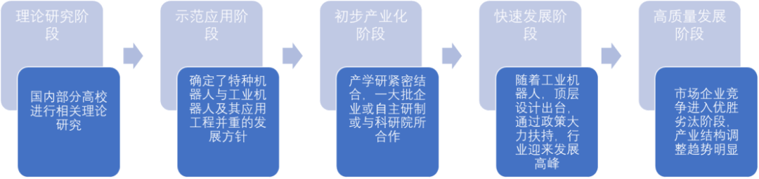 我国的工业机械人研究起头于20世纪70年代,大体可分为5个阶段,即理论研究阶段、示范使用阶段、初步财产化阶段、快速成长阶段、高质量成长阶段。