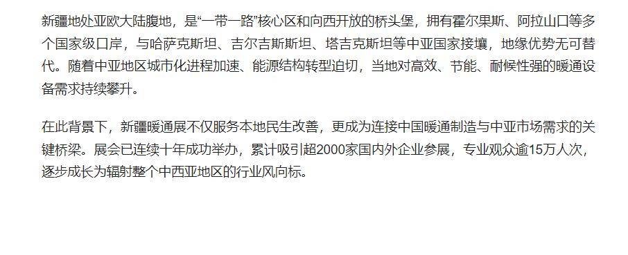 2026年4月16日至18日,第十一届新疆暖通博览会将正在乌鲁木齐新疆国际会展核心昌大启幕。做为中国西北地域规模最大、影响力最广的暖通专业展会,本届展会以“中亚门户,聚焦洁净能源转型”为焦点定位,深度融入国度“一带一”取“双碳”计谋,全面笼盖新疆经济走廊,并辐射陕西、甘肃、宁夏、青海及中亚五国市场,打制贯穿春夏日的暖通财产黄金商业链,为参展企业建立“一次参展,双沉市场”的高价值平台。