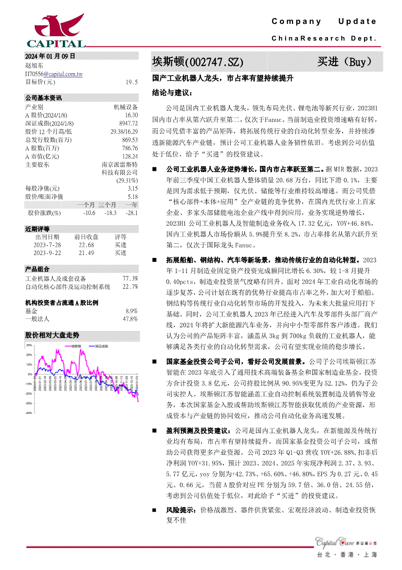 公司是国内工业机械人龙头,领先结构光伏、锂电池等新兴行业,2023H1国内市占率从第六跃升至第二,仅次于Fanuc。【慧博投研资讯】当前制制业投资增速略有好转,将拓展保守行业的从动化转型营业,并持续渗入新能源汽车财产链,估计公司工业机械人营业韧性照旧。(慧博投研资讯)考虑到公司估值处于低位,赐与“买进”的投资。公司工业机械人营业逆势增加,国内市占率跃至第二。据MIR数据,2023年前三季度中国工业机械人全体销量20。68万台,同比下滑0。1%,次要是由于需求低于预期,仅光伏、储能等行业维持较高增速。而公司凭仗“焦点部件+本体+使用”全财产链的合作劣势,正在国内光伏行业上百家企业、多家头部储能电池企业产线中获得使用,营业实现逆势增加,2023H1公司工业机械人及智能制制营业收入17。32亿元,YOY+46。84%,国内工业机械人市场份额从5。9%提拔至8。2%,市占率排名从第六跃升至第二,仅次于国际龙头Fanuc。拓展船舶、钢布局、汽车等新场景,鞭策保守行业的从动化转型。2023年1-11月制制业固定资产投资完成额同比增加6。30%,较1-8月提拔0。40pcts,制制业投资景气宇略有回升。面临2024年工业从动化市场的逐渐苏醒,加大对于船舶、钢布局等保守行业从动化转型市场的开辟投入,为将来多量量使用打下根本。同时,公司工业机械人2023年曾经进入汽车及零部件头部厂商产线年将扩大新能源汽车营业,并向中小型零部件客户渗入。我们认为公司的产物矩阵丰硕,涵盖从3kg到700kg负载的工业机械人,可以或许满脚各类行业的从动化转型需求,公司无望实现业绩的稳步增加。江苏智能正在2023岁尾引入了通用手艺高端配备基金和国度制制业基金,投资方合计投资3。8亿元,公司持股比例从90。95%变动为52。12%,仍为子公司实控人。埃斯顿江苏智能涵盖工业从动节制系统安拆制制及发卖等营业,本次国度基金入股或帮帮埃斯顿江苏智能获取优良的财产资本,构成本钱取财产链的协同效应,鞭策公司从动化营业高速成长。盈利预测及投资:公司是国内工业机械人龙头,正在新能源及保守行业均有结构,市占率无望持续提拔,而国度基金投资公司子公司,或帮帮公司获得更多财产资本。公司2023年Q1-Q3营收YOY+26。88%,扣非后净利润YOY+31。95%,估计2023、2024、3。93、5。77亿元,yoy别离为+42。73%、+65。60%、+46。80%,EPS为0。27元、0。45元、0。66元,当前A股价对应PE别离为59。7倍、36。0倍、24。55倍,考虑到公司估值处于低位,对此赐与“买进”的投资。风险提醒:价钱和激烈、器件供货严重、宏不雅经济波动、制制业投资恢复欠安